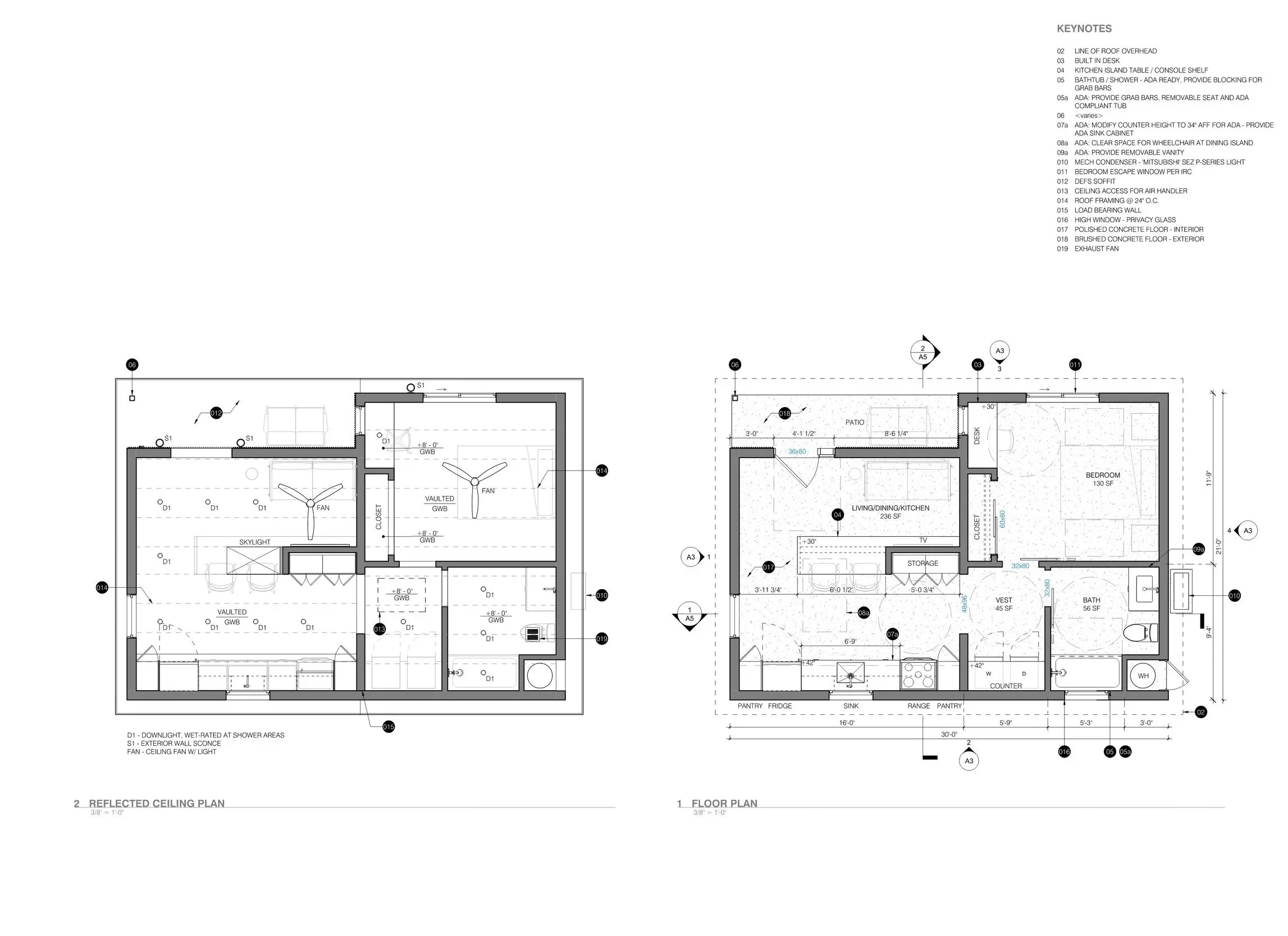 The project’s focus was to provide an accessible unit at a compact footprint. The floor plan intentionally avoids the typical appearance of accessible spaces, creating a more seamless and integrated design. The base project contains a mix of ADA and ADA ready elements with modifications noted on the plan on how to adapt elements shown. The clearances are also shown on the plan.