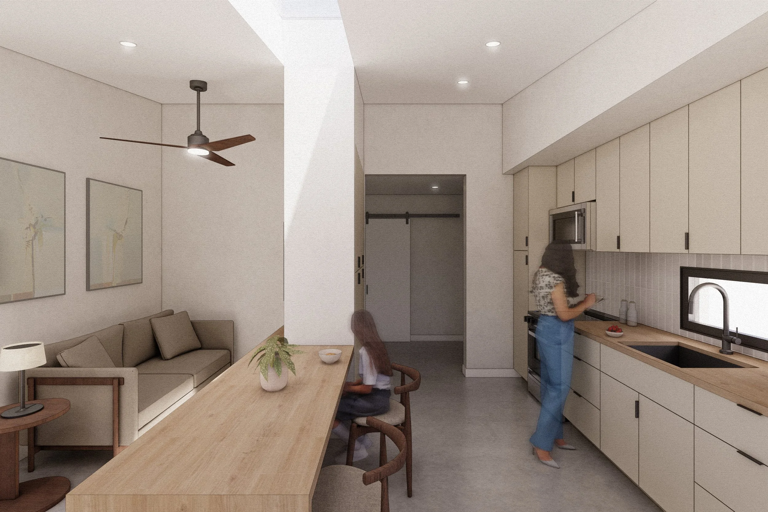 This ADU focuses on efficiency, offering a flexible 1-bed, 1-bath layout that can adapt to a wide range of lot sizes, orientations, privacy preferences, and budgets. The design consists of two separate modules: a living/dining/kitchen module and a bed/bath/laundry module. A second bed/bath/laundry module can be mirrored on the opposite side of the living/dining/kitchen module to create a 2-bed, 2-bath unit if desired.
